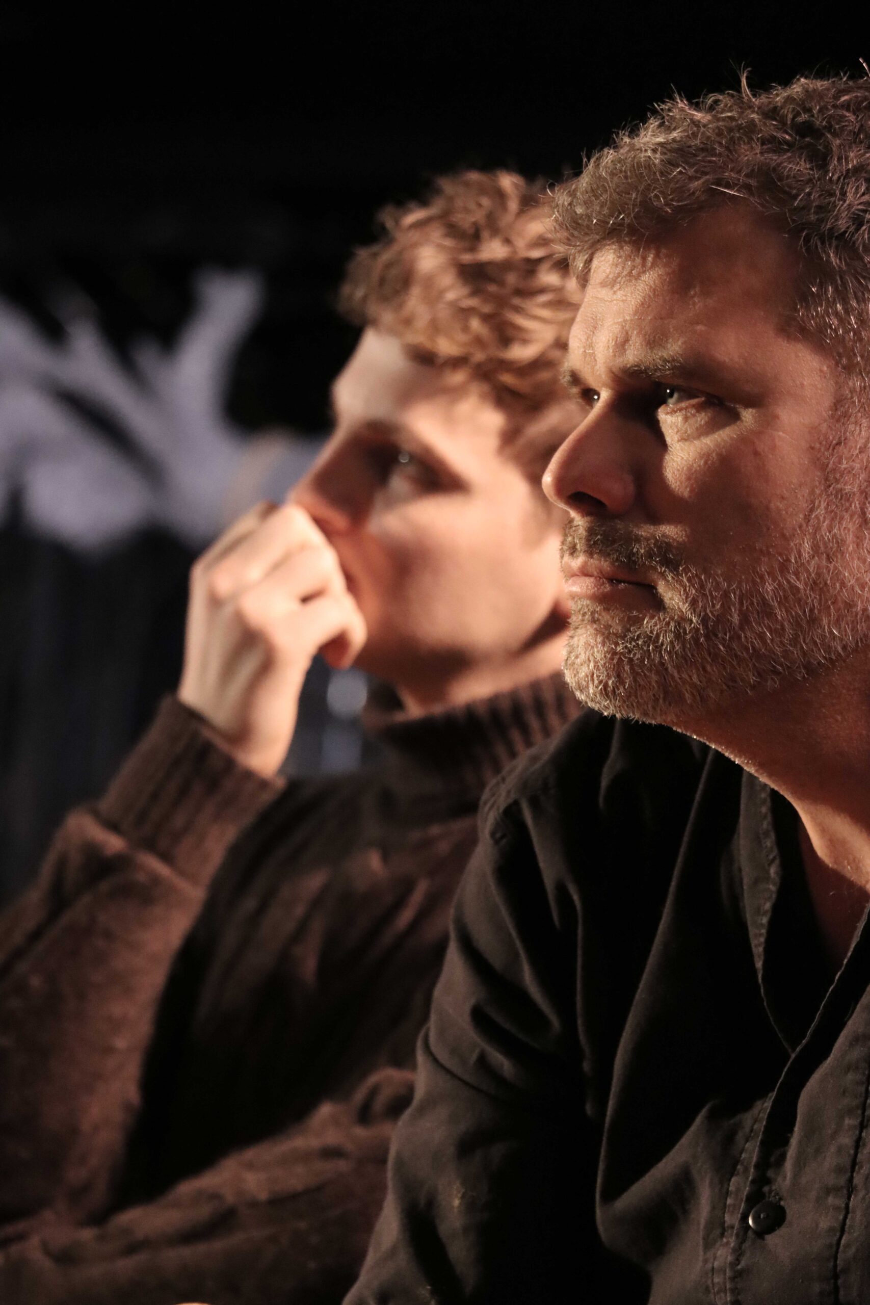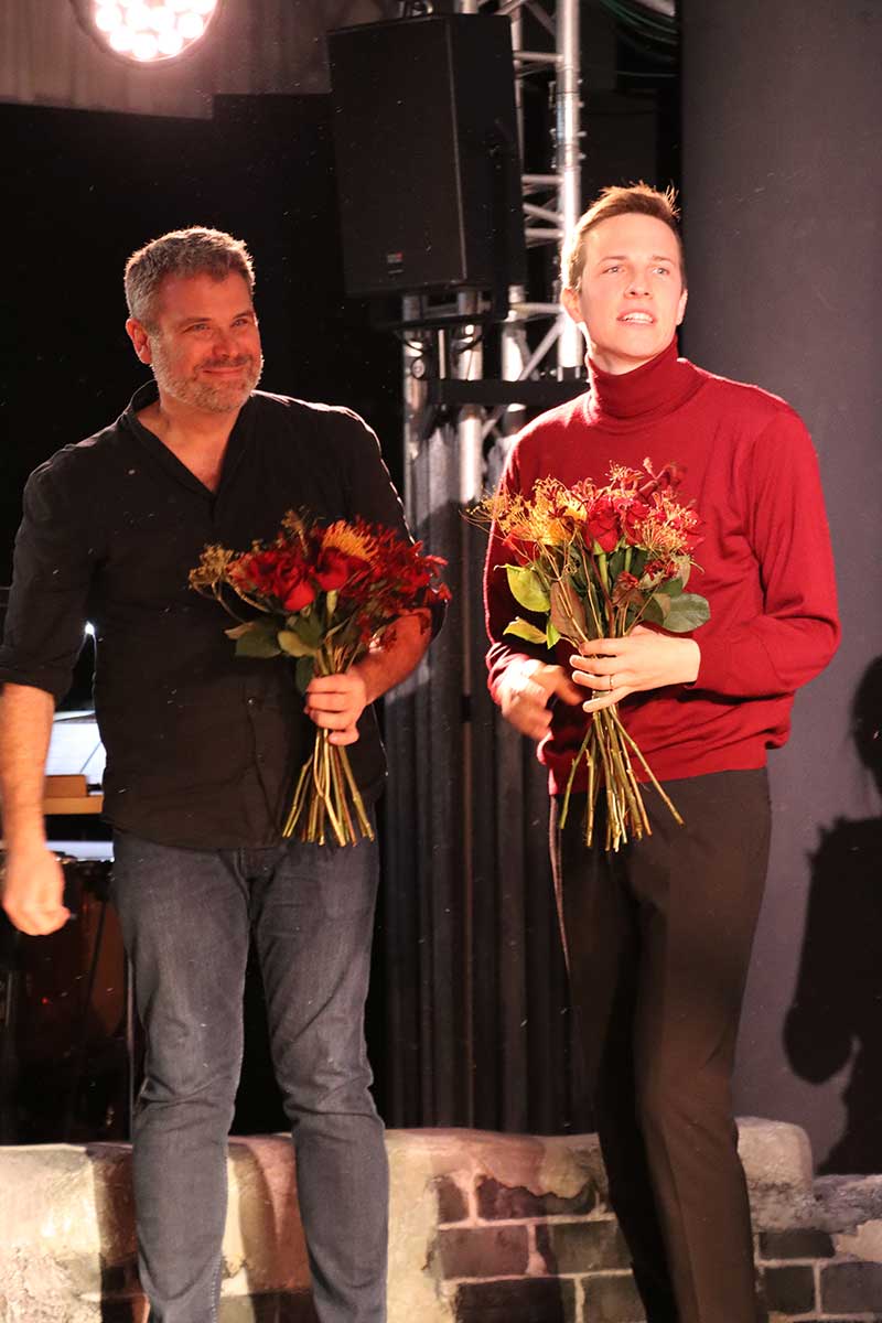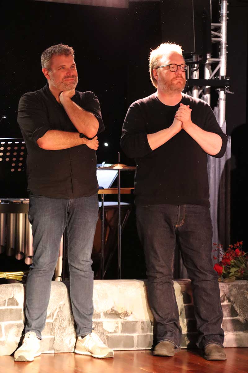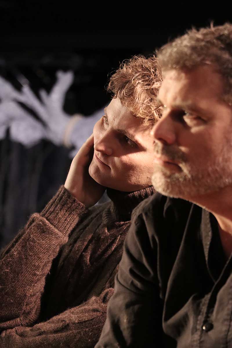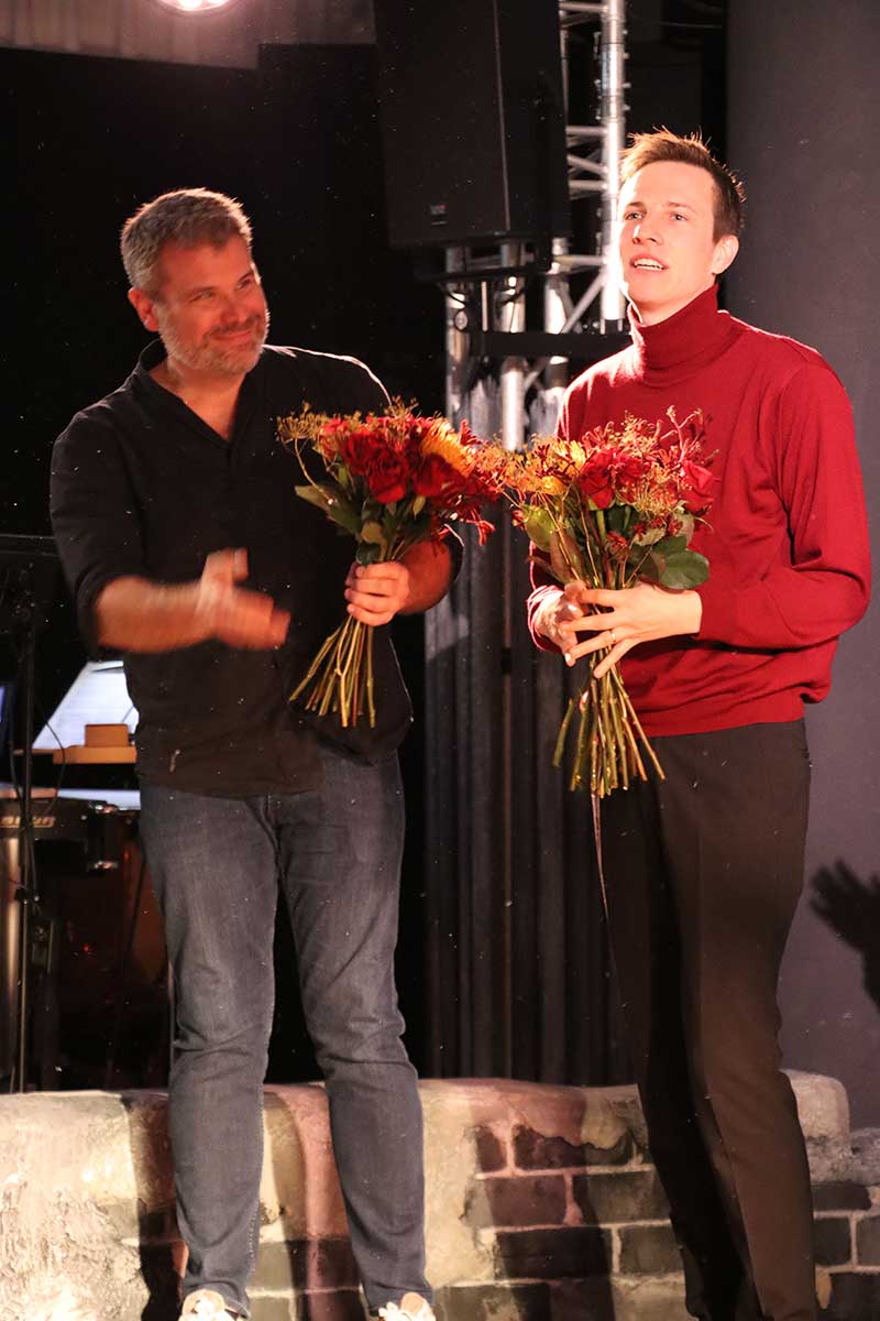 Komponist Edzard Locher hat das vielfach ausgezeichnete Theaterstück für Stimme und Perkussion vertont. Seine Musik ist reduziert, präzise und von großer innerer Spannung. Sie verzichtet bewusst auf Sentimentalität und lässt Raum für das Gesagte – und das Verschweigen. Getragen wird sie von dem eindrucksvollen Spiel des Perkussionisten Sven Pollkötter. Die musikalische Leitung lag bei Olivia Lee-Gundermann und Koji Ishizaka.