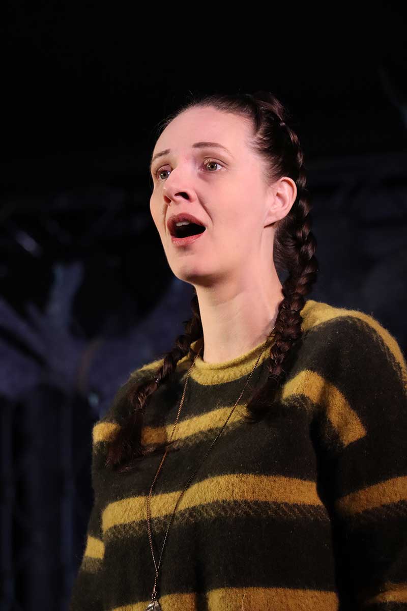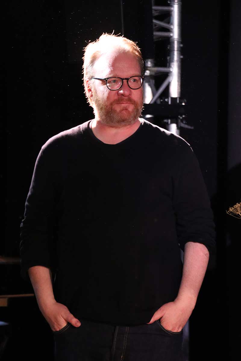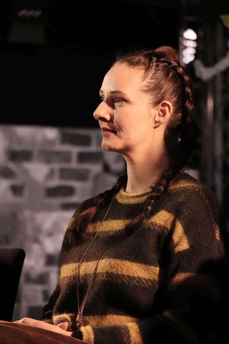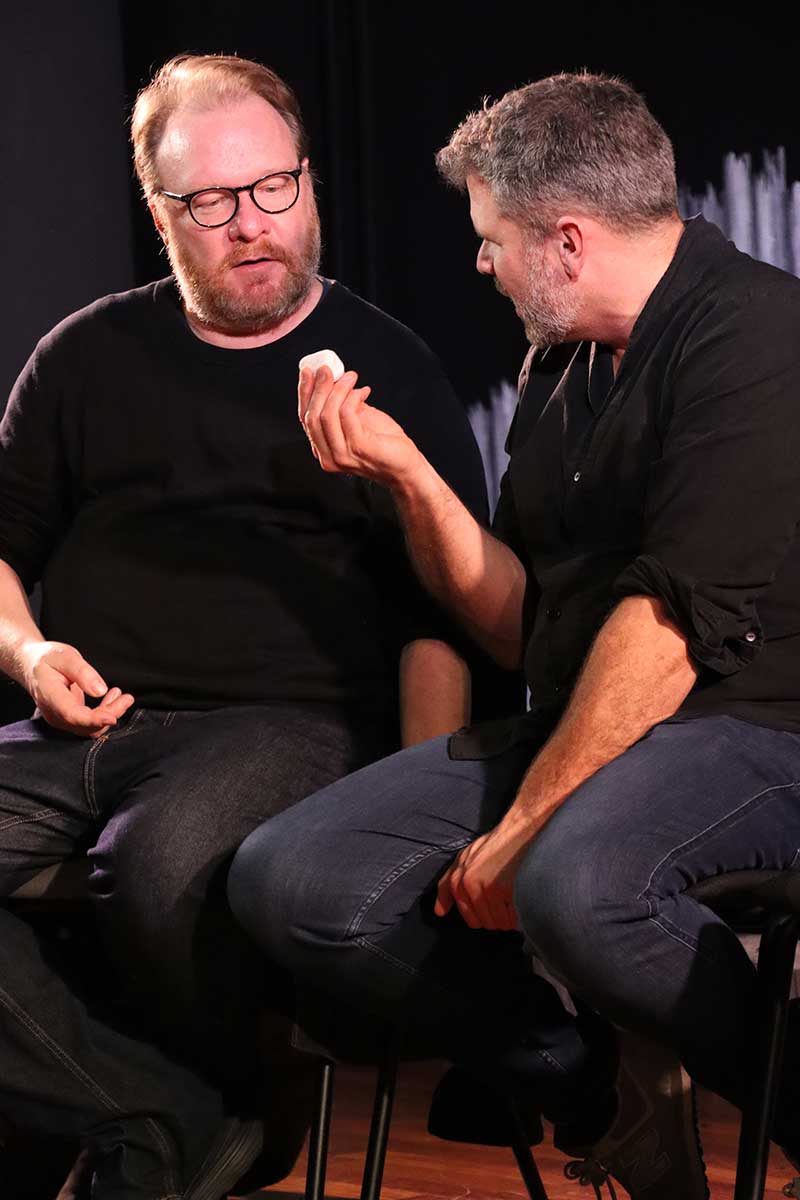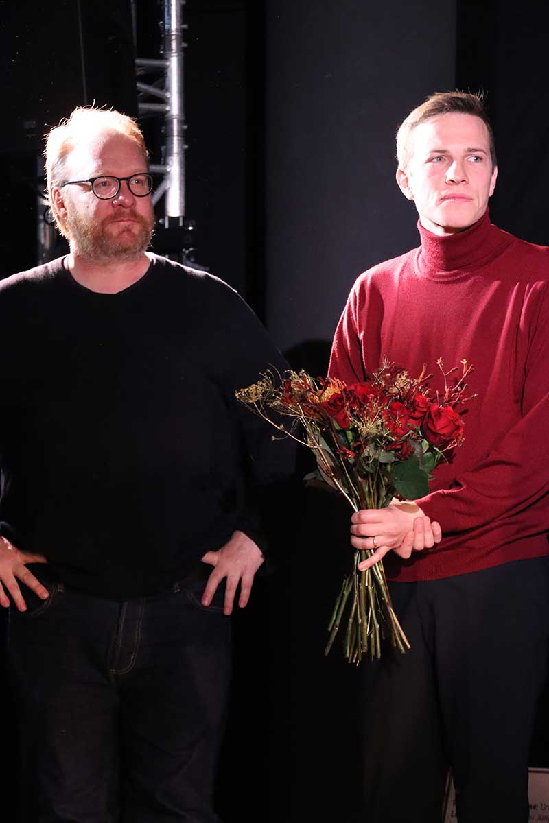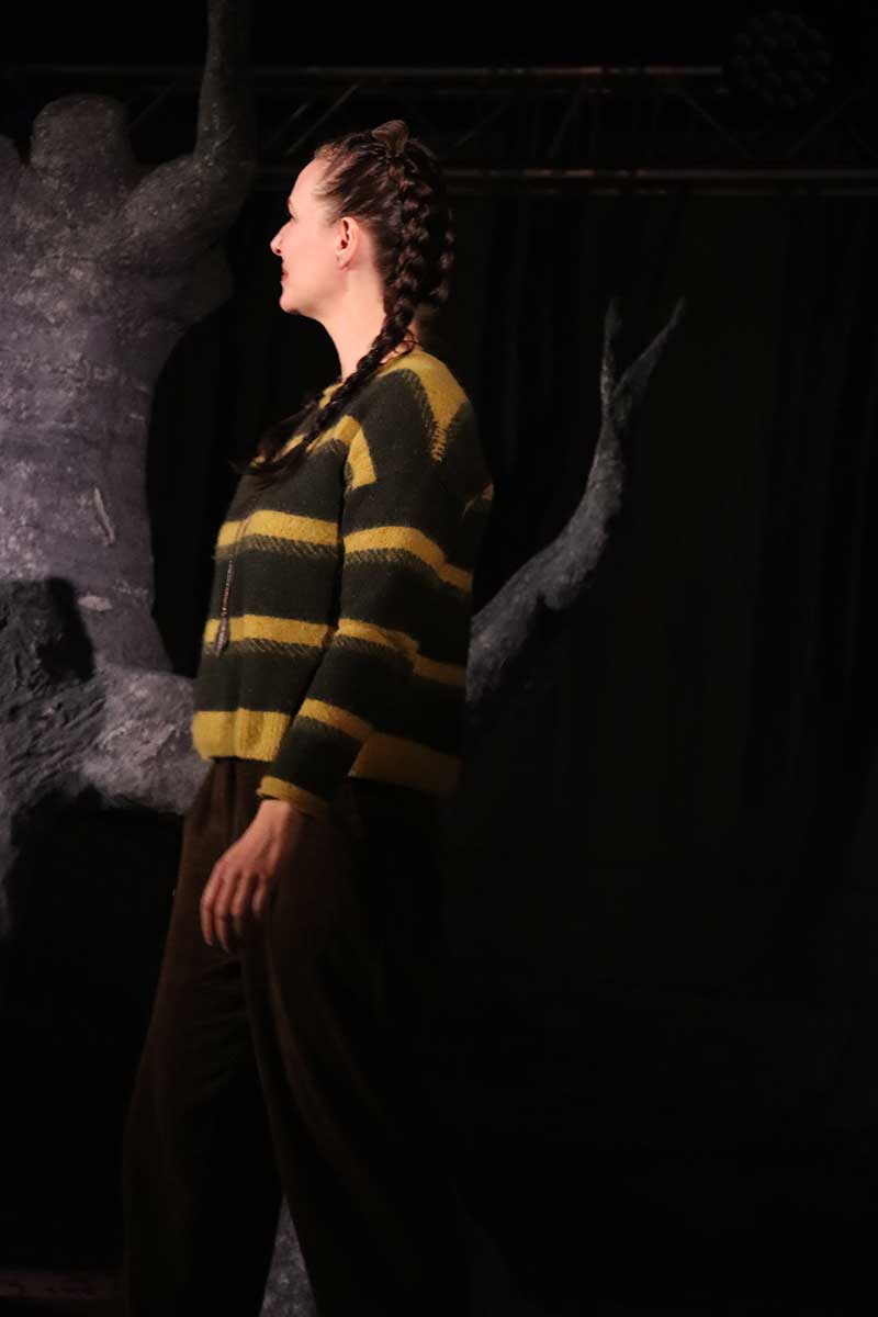Komponist Edzard Locher hat das vielfach ausgezeichnete Theaterstück für Stimme und Perkussion vertont. Seine Musik ist reduziert, präzise und von großer innerer Spannung. Sie verzichtet bewusst auf Sentimentalität und lässt Raum für das Gesagte – und das Verschweigen. Getragen wird sie von dem eindrucksvollen Spiel des Perkussionisten Sven Pollkötter. Die musikalische Leitung lag bei Olivia Lee-Gundermann und Koji Ishizaka.