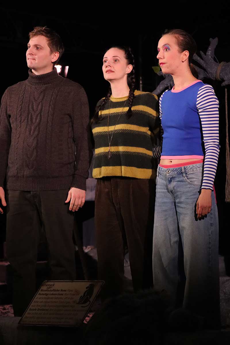 In der Regie von Stephan Rumphorst entfaltet sich das Stück konzentriert und klar. Bühne und Kostüme von Emine Güner bleiben bewusst schlicht und schaffen starke Bilder ohne illustrative Überdeutlichkeit. Die Dramaturgie von Dany Handschuh hält die Balance zwischen Erzählen und Zumuten. Wendy Krikken, Cosima Büsing und Franz Schilling verleihen den Tierfiguren emotionale Tiefe und große Glaubwürdigkeit.