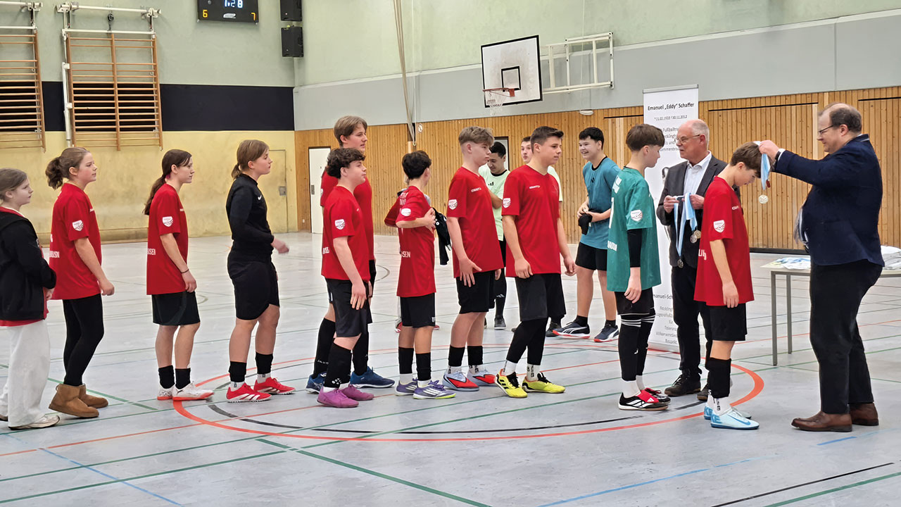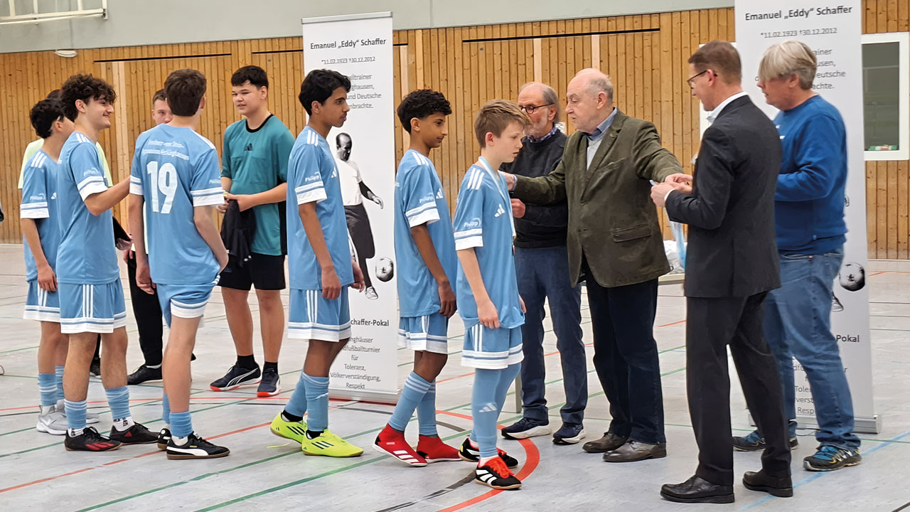 Als Prof. Dr. Mosche Schaffer gemeinsam mit Bürgermeister Axel Tschersich den Sieger-Pokal, die Sieger-Trikots und die goldenen Medaillen überreichte, war es mehr als eine Siegerehrung. Es war ein Moment der Erinnerung – und auch der Verantwortung. Der Name seines Vaters auf dem Pokal steht für ein Leben zwischen Verfolgung, Neuanfang und Versöhnung. Das erste „Emanuel-Schaffer-Fußballturnier“ in der Sporthalle Nord verband genau das: Geschichte, Haltung und Jugendfußball.