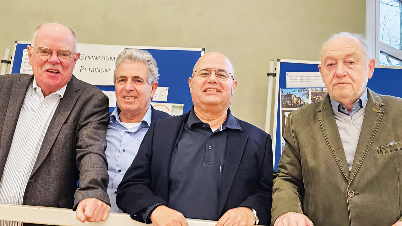 Bürgermeister Axel Tschersich und Prof. Dr. Moshe Schaffer beglückwünschen die Premierensieger der Otto-Burrmeister-Realschule